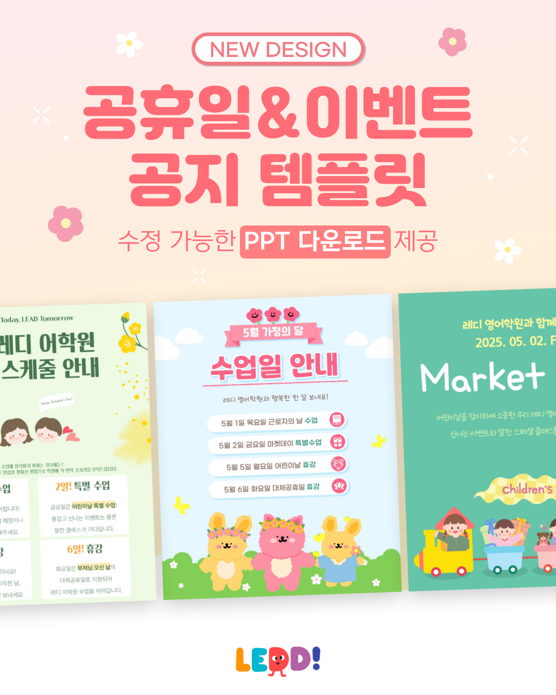 다가오는 가정의 달 연휴!레디 가족들의 학원 운영도 쉬워지도록안내문 템플릿을 준비했어요 💕ㆍ인스타그램 피드 비율에 딱 맞춘 디자인ㆍ폰트 포함 & PPT 파일로 쉽고 편한 편집🍀 첫 번째!『휴강/정상수업 안내문 템플릿 3종』🍀 두 번째!어린이날 이벤트 공지에 유용한『마켓데이 포스터 3종』🍀 마지막!레디 키즈와 함께 웃고 즐기는『Tongue Twister 액티비티 PPT』